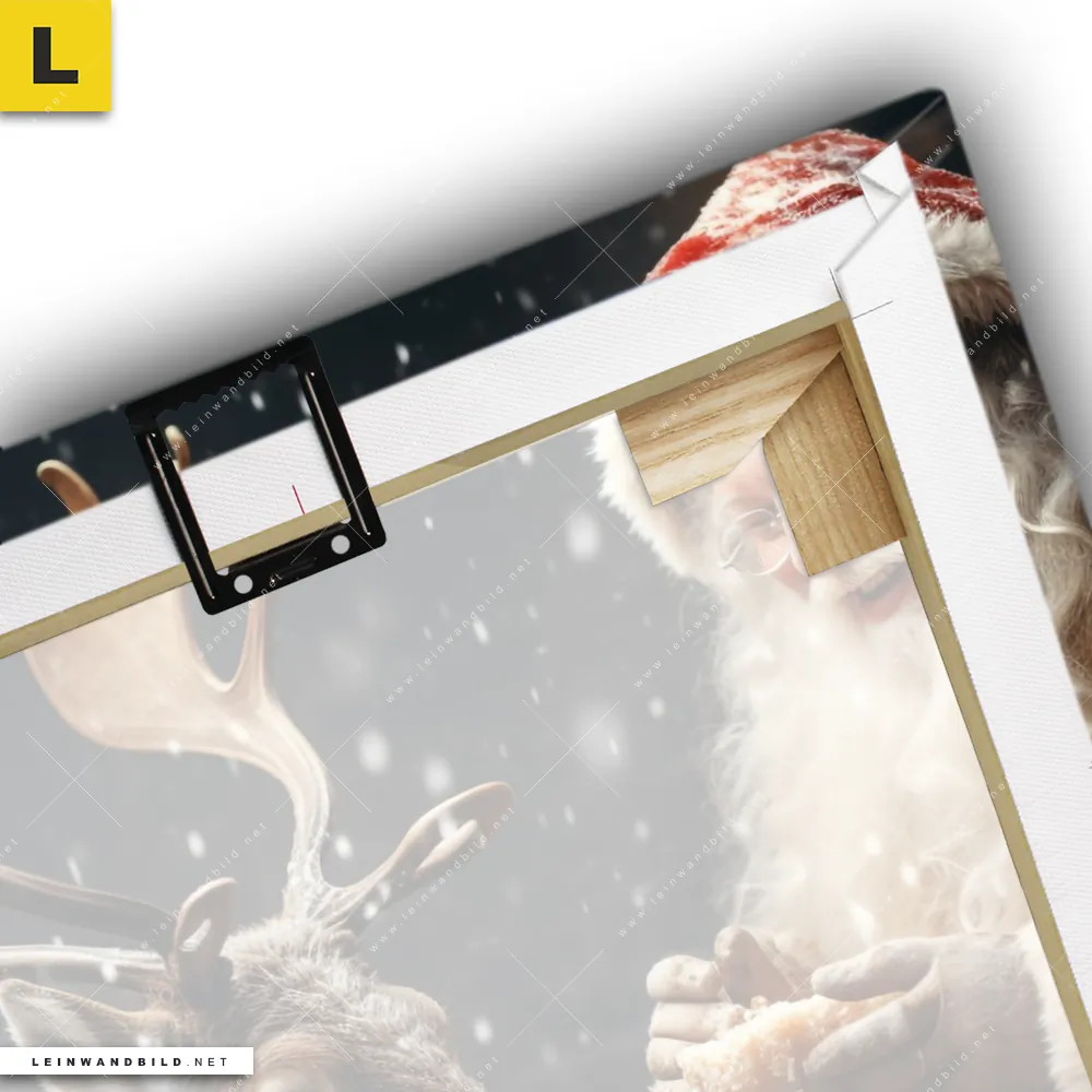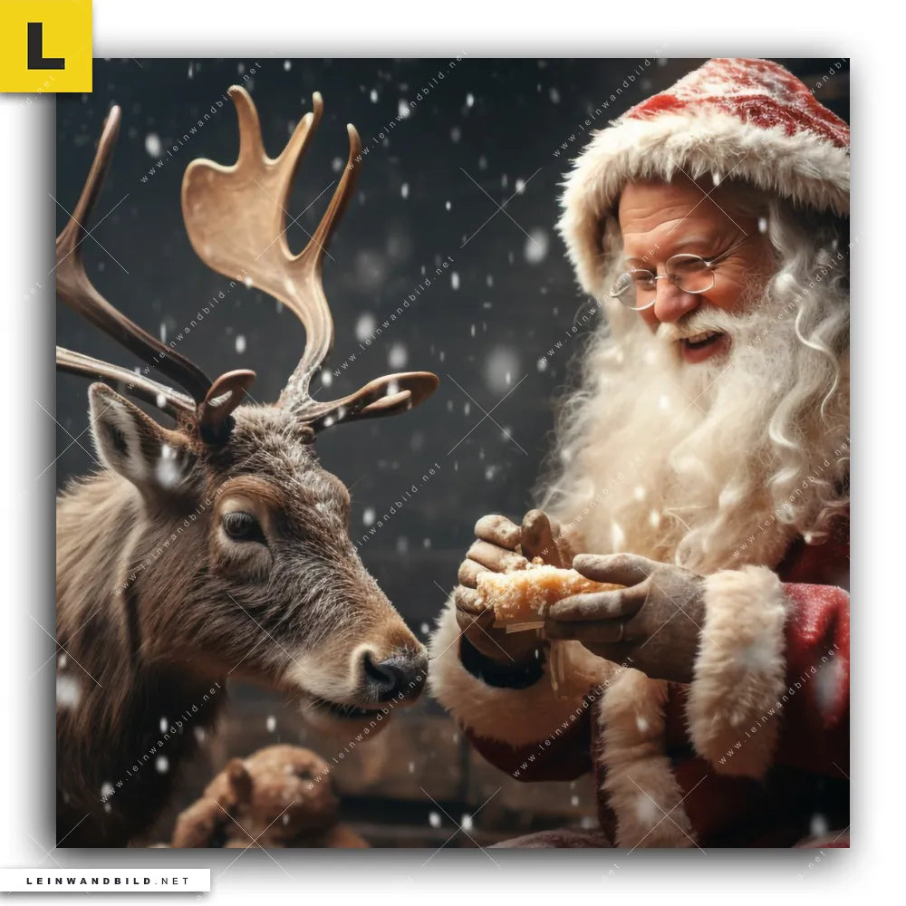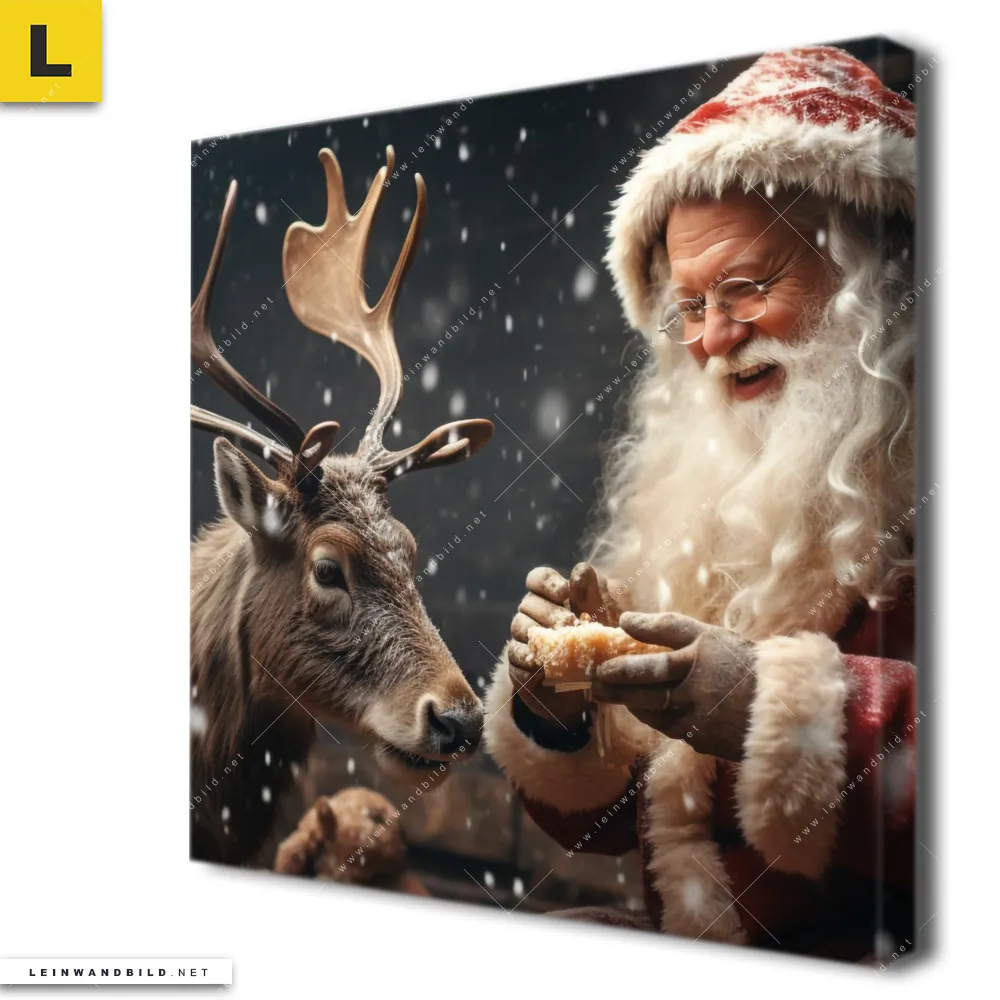 Leinwandbild | Weihnachtsmann füttert Rentier | Quadrat
