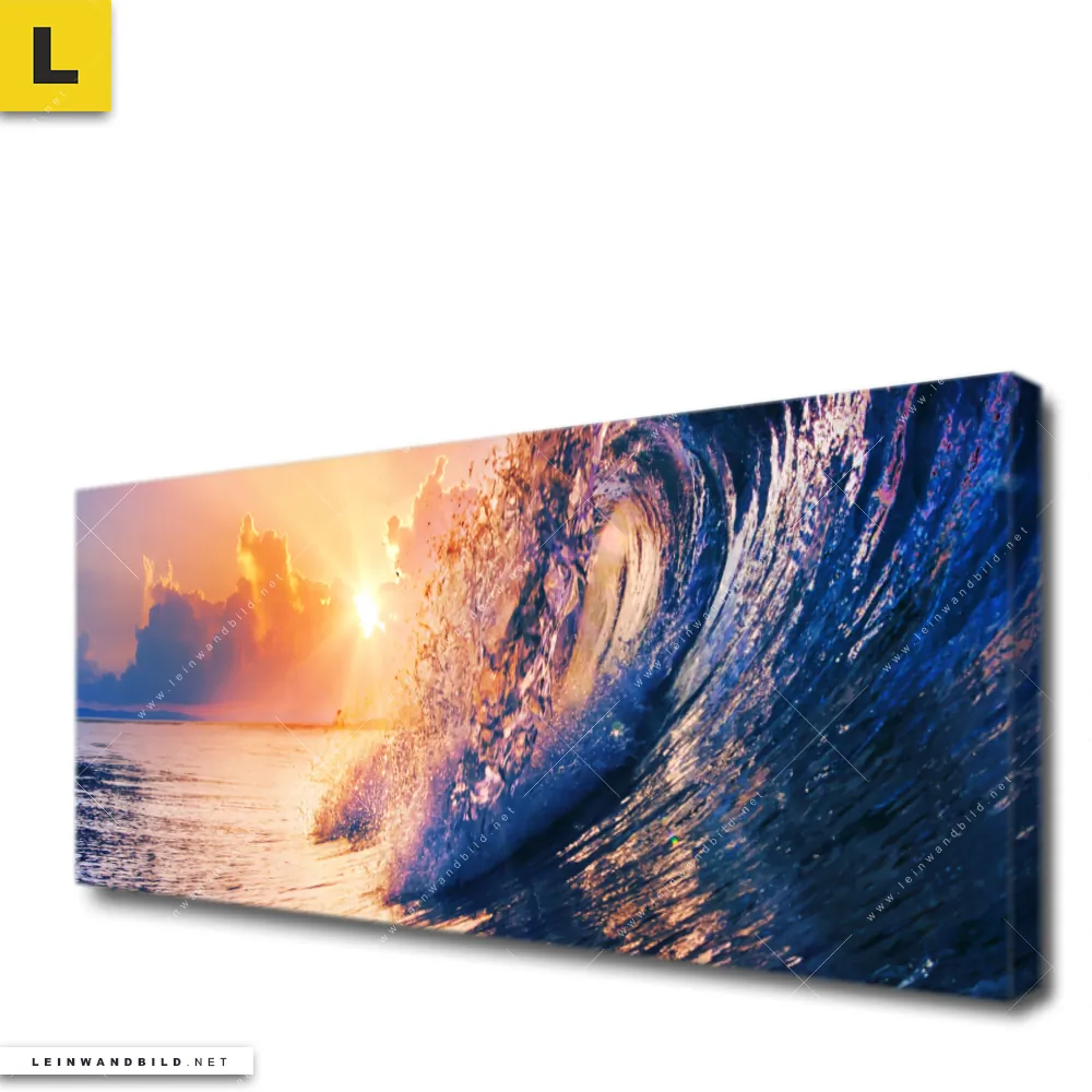 Du konfigurierst Dein individuelles Leinwandbild | Welle im Sonnenuntergang | Panorama und wir produzieren es NEU für Dich. Unsere Landschaften, Strand - Meer Leinwände sind KEINE Lagerware. Du bist Dir unsicher, welches Motiv oder Format das richtige für dein individuelles Keilrahmenbild ist, dann helfen wir dir gerne weiter und beraten dich!